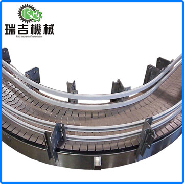 塑料鏈板輸送機(jī)又稱為塑鋼鏈板輸送機(jī)或頂板鏈輸送機(jī),以標(biāo)準(zhǔn)鏈板為承載面,由馬達(dá)減速機(jī)為動力傳動;我們可以通過多列鏈板并行,使塑鋼鏈板輸送機(jī)做的很寬并形成差速,利用多列鏈板的速度差使多列輸送在無擠壓的情況下變?yōu)閱瘟休斔,從而滿足飲料貼標(biāo)、灌裝、清洗等設(shè)備的單列輸送的要求,同樣也可以使單列變成多列并行走緩慢,從而產(chǎn)生儲存量,滿足殺菌機(jī)、儲瓶臺、冷瓶機(jī)的大量供料的要求,我們可以將兩條鏈板輸送機(jī)的頭尾部做成重疊式的混合鏈?zhǔn)沟闷浚ü蓿w處于動態(tài)過度狀態(tài),使輸送線上不滯留物料,可以滿足壓力和無壓力輸送,解決了中、高速生產(chǎn)線輸送時擠、卡、倒、破、噪聲大、不穩(wěn)定可靠等問題,鏈板輸送機(jī)被廣泛的運(yùn)用在飲料、啤酒、日化、制藥、汽車缸套、活塞、濾清器、小五金件生產(chǎn)的各個環(huán)節(jié)。